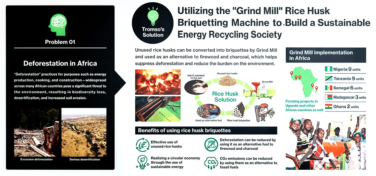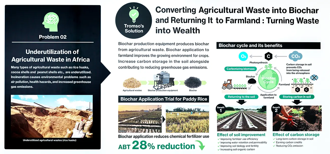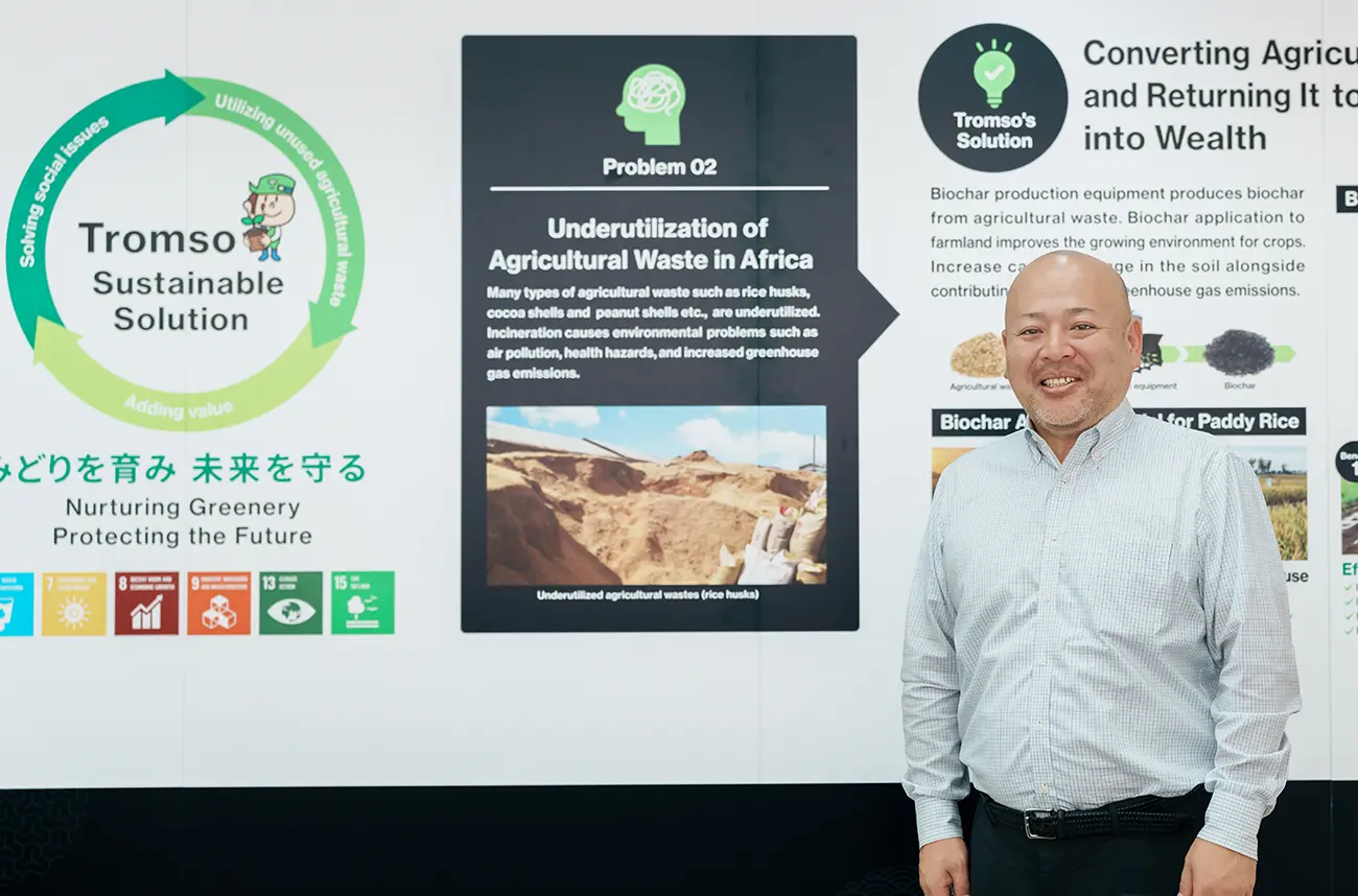 もみ殻を固形化する技術から発展し、バイオ炭の製造装置開発から営農指導、カーボンクレジット化まで一貫した事業モデルを展開。アフリカや東南アジアをはじめ、世界が直面する資源の有効活用や農業の生産性向上などに貢献しています。